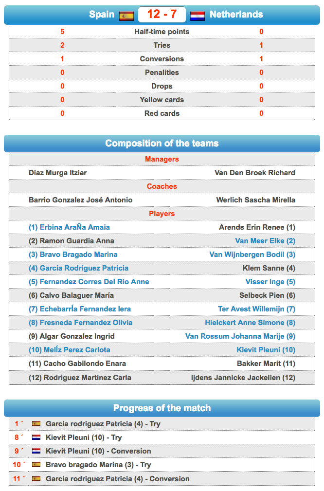 Marcador: Min 1 Ensayo de Patricia García 5-0 // Min 8 Ensayo y transformación de Holanda 5-7 // Min 9 Ensayo de Marina Bravo y transformación de Patricia García 12-7.
