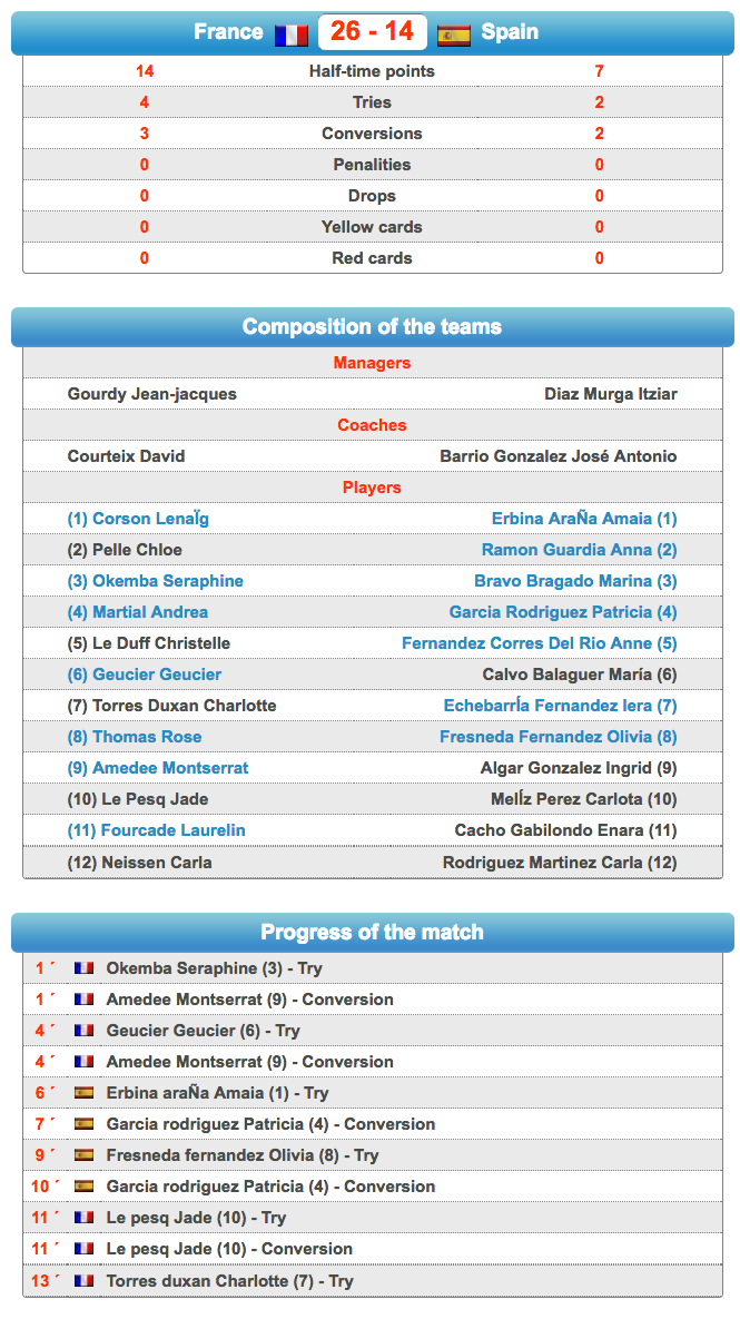 Marcador: Min 1 Ensayo y transformación de Francia 7-0 // Min 5 Ensayo y transformación de Francia 14-0 // Min 7 Ensayo de Iera Echebarría y transformación de Patricia García 14-7 // Min 9 Ensayo de Olivia Fresneda y transformación Patricia García 14-14 // Min 12 Ensayo y transformación de Francia 21-14 // Min 14 Ensayo de Francia 26-14.