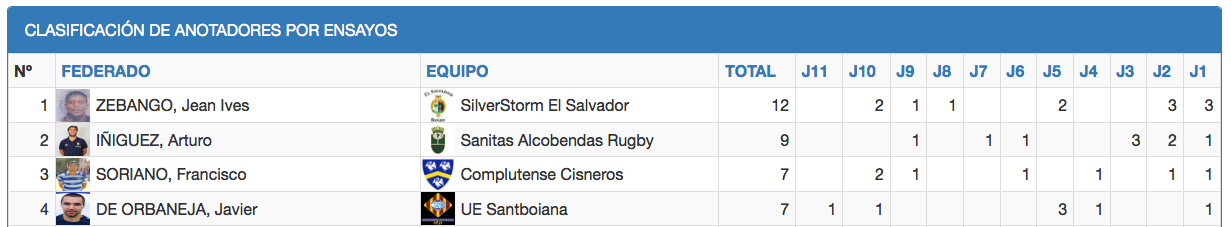El tryman de la Liga indiscutible es el ala francés del SilverStorm El Salvador Jean-Yves Zebango que con 12 marcas y a falta de jugar un partido lidera la clasificación de máximos ensayadores seguido por Arturo Iñiguez con 9, de Sanitas Alcobendas Rugby, y por Fran Soriano y Javier De Orbaneja con 7, de Complutense Cisneros y UE Santboiana.