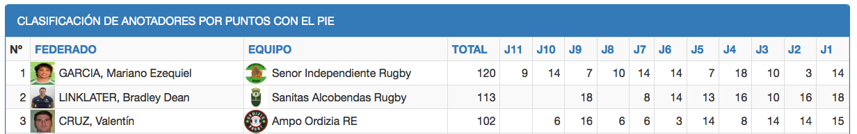 El apartado de la anotación con el pie lo lidera Mariano García que se aprovecha de que su equipo, el Senor Independiente, sea el que más busca los palos y suma 120 puntos, más de 10 por partido, seguido de cerca del internacional por España del Sanitas Alcobendas Brad Linklater con 113 y el apertura del AMPO Ordizia Valentín Cruz con 102.