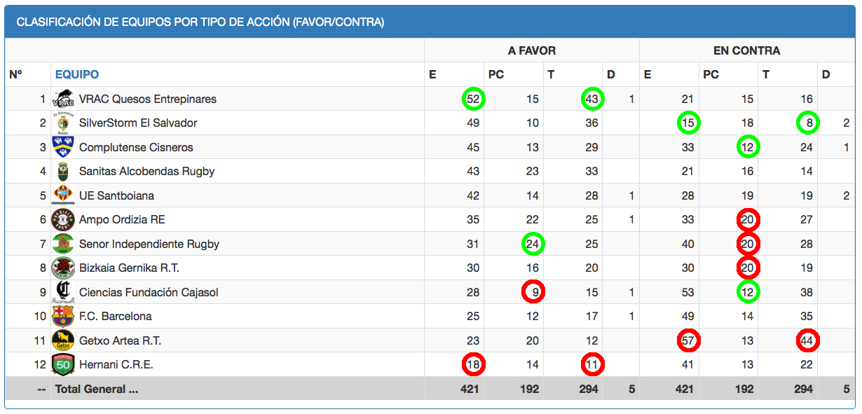 Llega como líder, aprovechándose de ese partido que queda por disputarse, el VRAC Quesos Entrepinares. Diego Merino ha conseguido revertir la tendencia del equipo que en la tercera jornada salía de los puestos de Play Off por primera vez desde la temporada 2014/2015. El Quesos está líder, entre otras cosas, por ser el equipo que más ensayos ha marcado en la primera vuelta, 52 lo que son casi 5 por partido y ha transformado 43, por lo que convierten más del 82% de sus ensayos. Muy lejos quedan las 18 marcas del Hernani, el peor equipo en el apartado ofensivo, y sus 11 conversiones. En cuanto al equipo que más rentabilidad saca a los golpes de castigo el Senor Independiente de Santander es el primero de la tabla con 24 dianas, más de dos por encuentro, casi tres veces más golpes anotados que el Ciencias Fundación Cajasol que cierra éste apartado con 9 puntapiés de castigo.