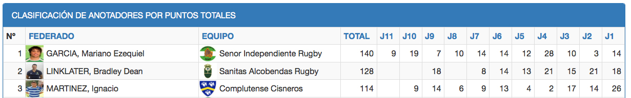 Y el mismo Mariano García, gracias a haber anotado cuatro ensayos, lidera la clasificación de puntos totales de División de Honor con 140 puntos, casi 13 puntos por partido de media, seguido por Brad Linklater con 128, con mejor media anotadora que Mariano al haber disputado un partido menos, y cierra el podium el ala de Complutense Cisneros Ignacio Martínez con 114, gracias a 84 puntos al pie y 6 ensayos.