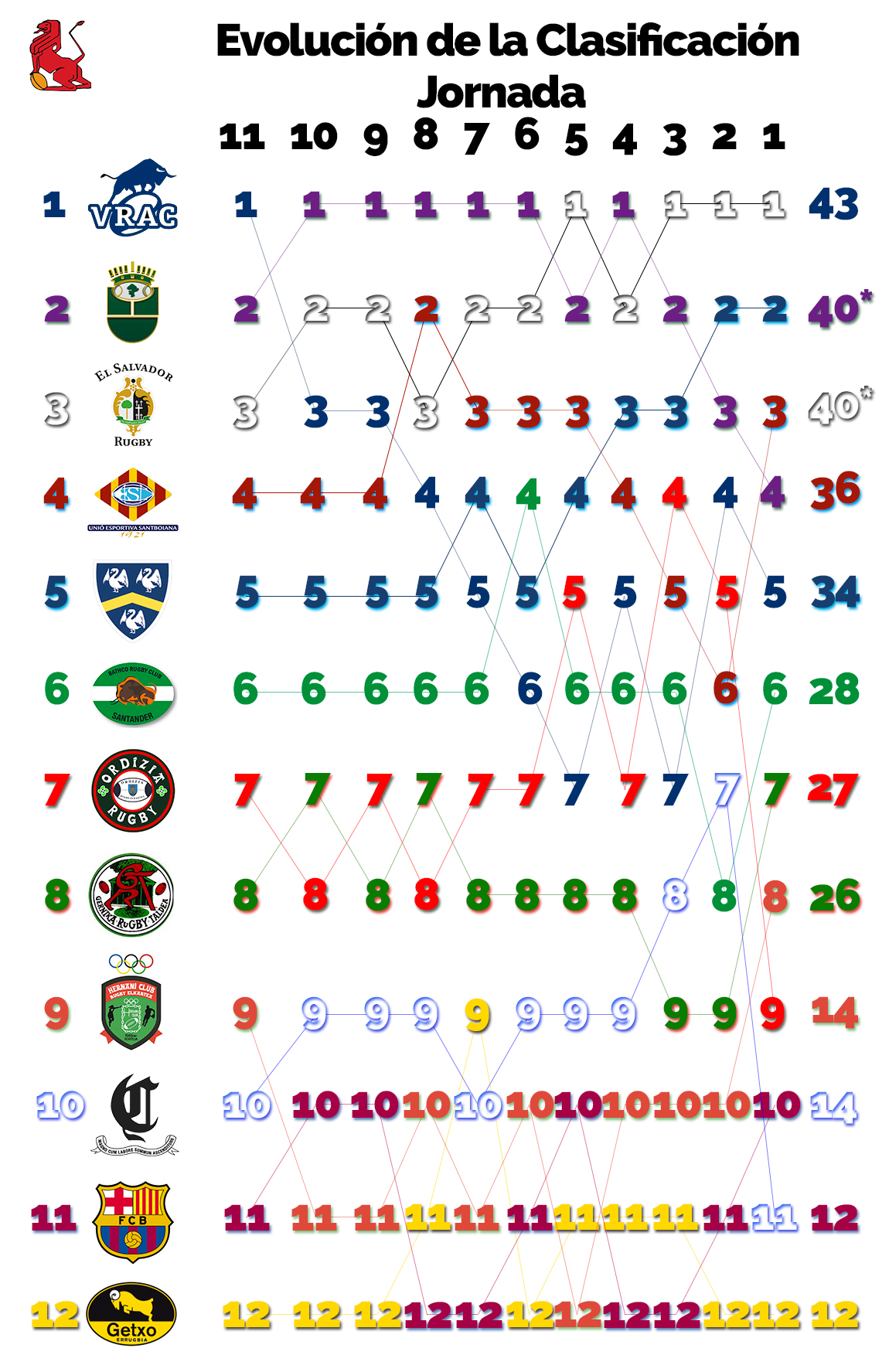 En cuanto al número de líderes y colistas en estos momentos, insistimos en que somos conscientes de que queda un partido por disputarse, ha habido los mismos: tres. Han liderado la máxima competición nacional el actual campeón, SilverStorm a lo largo de cuatro jornadas, el Sanitas Alcobendas Rugby, que con seis jornadas ha sido el que más tiempo ha conseguido estar en lo alto de la tabla, y el VRAC Quesos Entrepinares que termina la primera vuelta en lo más alto. Por abajo han sido colistas el Getxo Artea, que lo fue en la primera y en la undécima y es quien más ha estado como farolillo rojo, el FC Barcelona que estuvo último cuatro jornadas y el Hernani que cerró la clasificación en la quinta jornada.