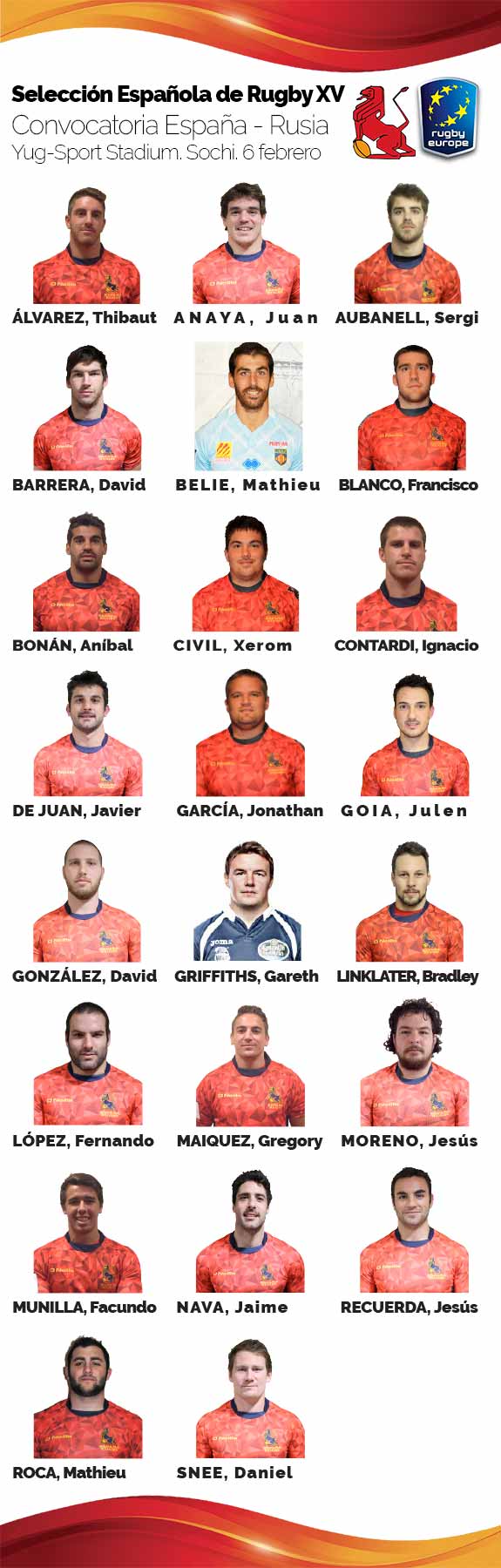 El Seleccionador nacional, Santiago Santos, ha dado a conocer la lista de 23 jugadores para enfrentarse a Rusia en Sochi el próximo 6 de febrero en lo que será el primer partido de la segunda vuelta para España. En la lista, muy continuista con las últimas convocatorias del XV del León, destacan la inclusión de dos nuevos tres cuartos, el apertura-centro del VRAC Quesos Entrepinares Gareth Griffiths y el apertura de USAP Perpignan Mathieu Belie. En la última visita de la Selección a Sochi los Osos se impusieron por un ajustado 13 a 9, en 2013, y el año pasado, en la ida del torneo, los nuestros ganaron por un contundente 42-20. El global histórico de partidos está muy a favor de Rusia: