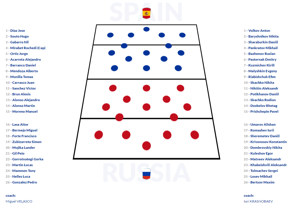 Alineación España: 1. José DÍAZ, 2. Hugo SOUTO, 3. Nil GABARRO // 4. Rochedi MIRABET (C), 5. Jorge ORTIZ // 6. Alejandro ACARRETA, 7. Daniel BARRANCO, 8. Alberto MENDOZA // 9. Tomás MUNILLA, 10. Juan CARRASCO // 11. Víctor SÁNCHEZ, 12. Alexis BRUN, 13. Alejandro ALONSO, 14. Martín ALONSO, 15. Manuel MORENO.