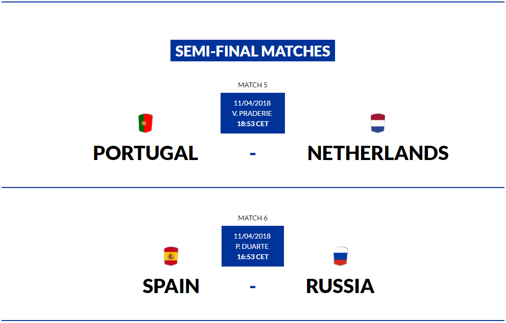 La otra semifinal enfrentará dos horas después a Portugal, anfitrión y actual Campeón de Europa Sub 20, y a Países Bajos, quien dio la sorpresa en la fase de cuartos de final, venciendo a Rumanía (38-40) en un gran partido.