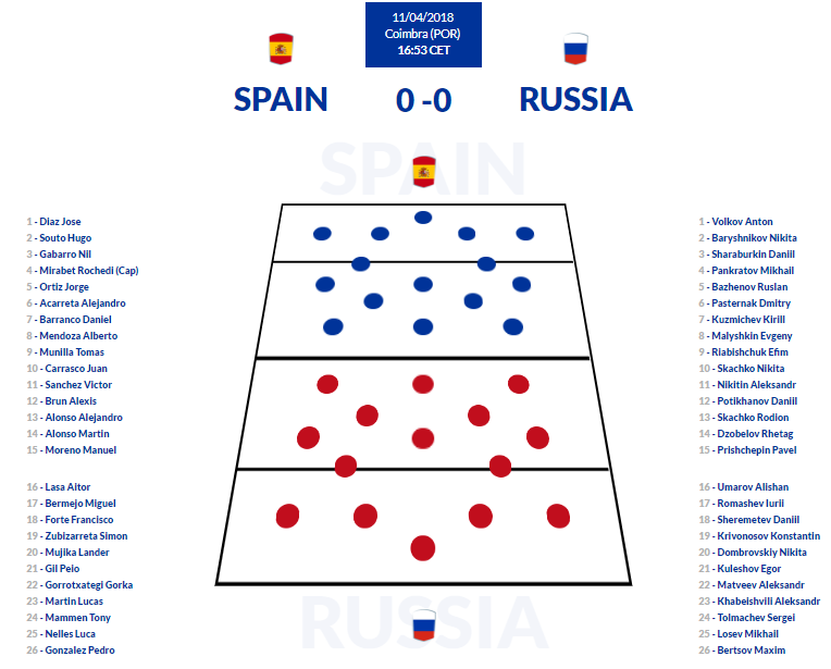 Alineación España: 1. José DÍAZ, 2. Hugo SOUTO, 3. Nil GABARRO, 4. Rochedi MIRABET (c), 5. Jorge ORTIZ, 6. Alejandro ACARRETA, 7. Daniel BARRANCO, 8. Alberto MENDOZA, 9. Tomás MUNILLA, 10. Juan CARRASCO, 11. Victor SÁNCHEZ, 12. Alexis BRUN, 13. aLEJANDRO alonso, 14. Martín ALONSO, 15. Manuel MORENO.