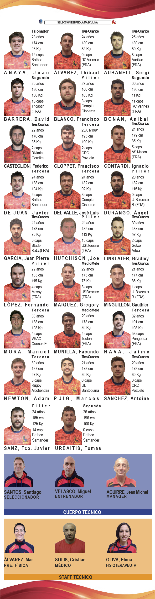El Seleccionador Nacional ha convocado un total de 26 jugadores para el campeonato, donde mantiene el bloque que participó en el Campeonato de Europa de Naciones y lo complementa con jugadores jóvenes y con proyección y algunos viejos conocidos del XV del León.