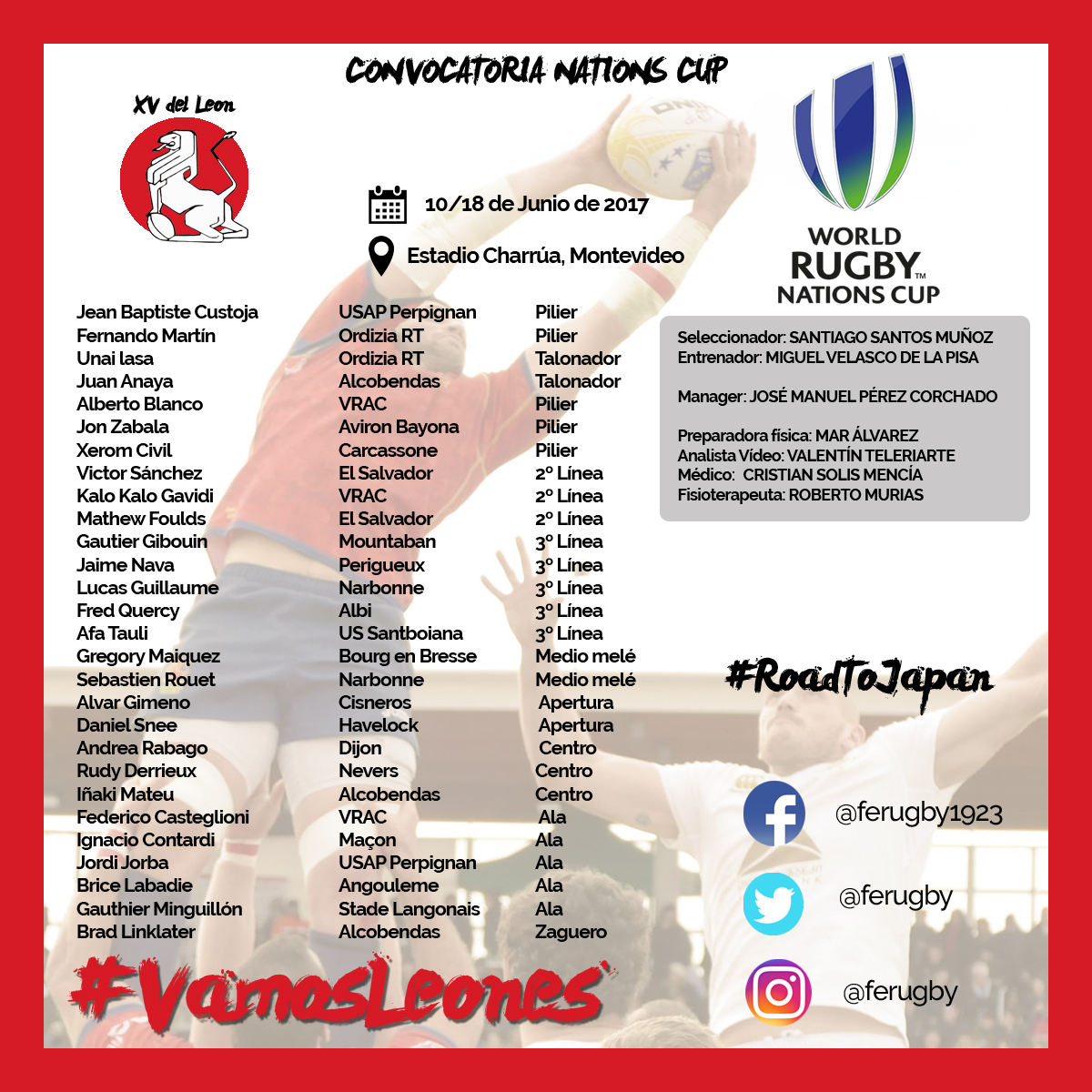 Entre los convocados destacan las incoporaciones de Jean Baptiste Custoja, pilier del USAP Perpignan, Afa Tauli, el jugador de la Santboiana de origen neozelandés que se llevó el reconocimiento al MVP en la Copa del Rey, o el joven Andrea Rabago, subcampeón del mundo Sub 20, que debuta junto a algunos de sus compañeros como Iñaki Mateu, Alvar Gimeno, Jaime Mata o Jordi Jorbá.