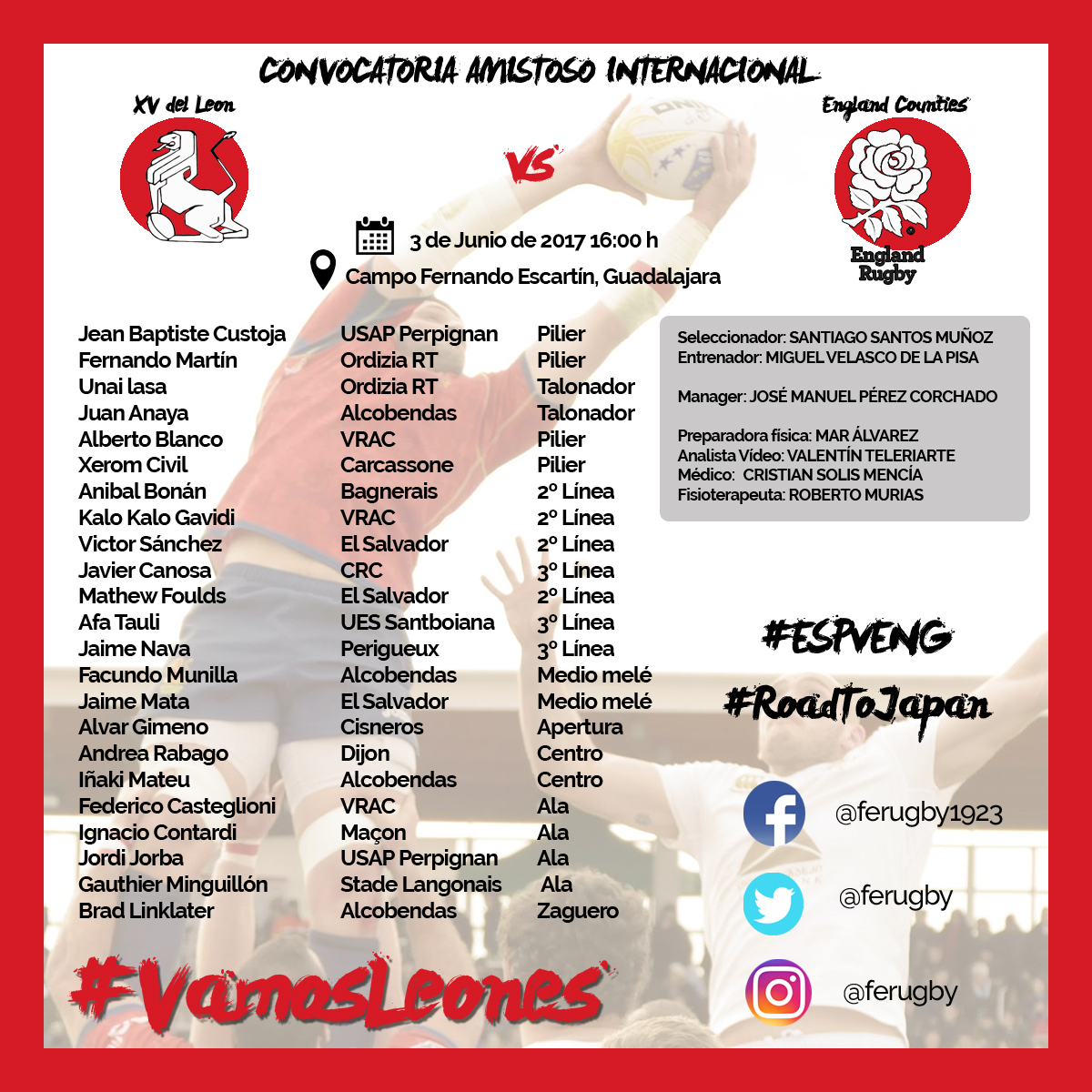Santiago Santos ya ha hecho público quienes van a ser los 23 jugadores que se enfrenten el próximo día 3 de junio en Guadalajara a la Selección de England Counties, equipo creado en 2002 y que reúne a algunos de los mejores jugadores de toda Inglaterra que hayan participado en el County Challenge o campeonato por provincias. Este partido va a servir para que la maquinaria del equipo siga en funcionamiento y mantener la preparación de cara a la Clasificación para el Mundial de 2019 en Japón, además de para probar a algunos jugadores jóvenes que vienen demostrando un muy buen juego en la Selección Sub 20.