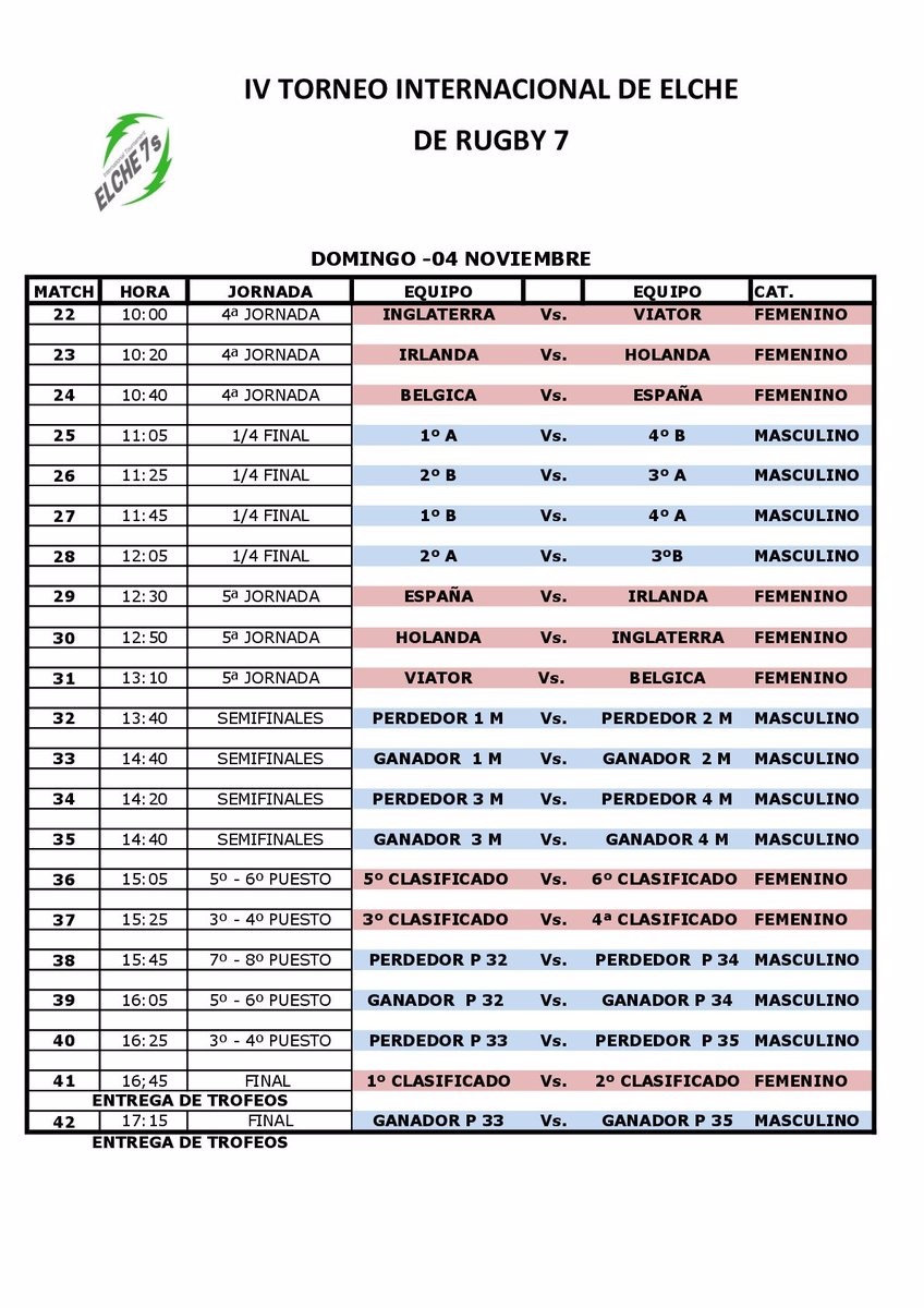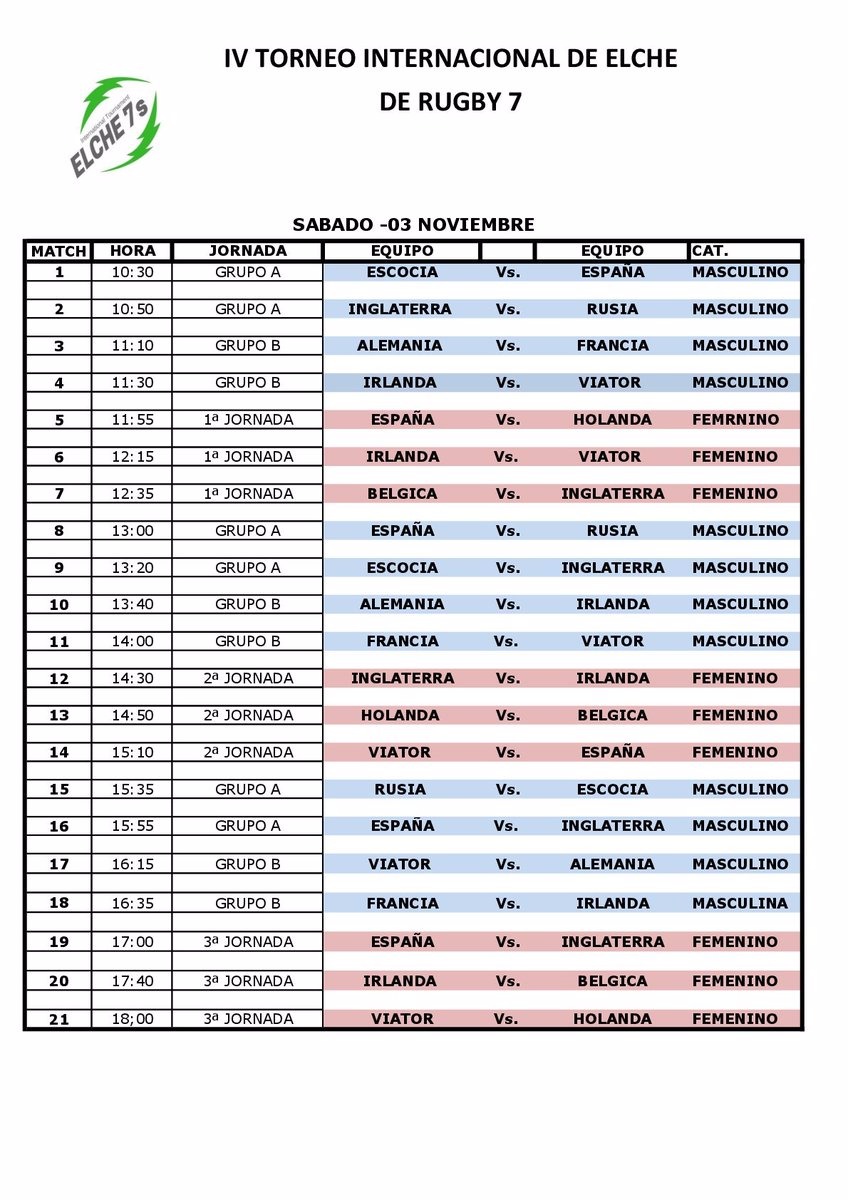 Aquí tenéis los horarios de los partidos. Como siempre, podéis seguir el transcurso del torneo en nuestro Twitter: @ferugby. También podéis consultar más información sobre el torneo en @elche7s.