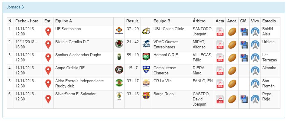 El domingo comenzaba con el duelo de mitad de tabla entre la Unió Esportiva Santboiana y un UBU Colina Clinic que no pudo repetir en el Baldiri Aleu la gesta de la jornada anterior ante el SilverStorm El Salvador. Los hombres de Martinena se llevaron un igualadísimo encuentro por 37-29 gracias en parte a una actuación espectacular de su medio melé y capitán Héctor García, que anotó un hat-trick en la primera mitad, que más tarde remataron sus compañeros con otros tres ensayos en la segunda parte. Esta victoria hace escalar a los catalanes dos puestos en la general, y se colocan séptimos a las puertas de los puestos de play-off, mientras que los burgaleses caen de la sexta a la octava plaza. Este encuentro también afectaba a la clasificación para la Copa, al pertenecer ambos equipos al Grupo 2. Así pues, Aparejadores se queda sin opciones de acceder a la fase final, mientras que la Santboiana se mide a Alcobendas en la jornada 10 y quien gane pasará a semifinales.