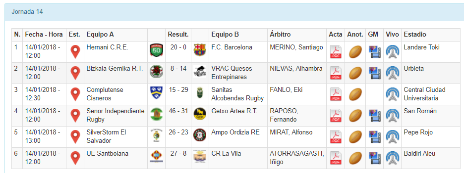 Abrían la jornada precisamente estos dos equipos, y Hernani daba la sorpresa al llevarse el encuentro gracias al pie de su apertura Anartz Elosegi, y a dos ensayos obra también de su número diez y de su pilier Eneko Noriega. Hernani suma cuatro valiosos puntos en la tabla y se aleja de los puestos de descenso y promoción, y el FC Barcelona se queda con el último de puesto de Play Off pero vuelve a Barcelona sin puntos.