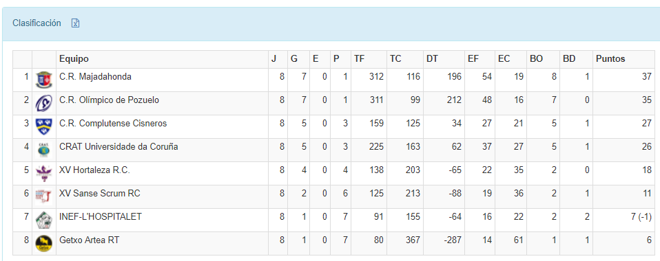 El domingo Majadahonda conseguía su séptima victoria con bonus consecutiva 34-26 ante CRAT Universidade Da Coruña, que casi da la sorpresa con un inicio de partido eléctrico en el que consiguió posar dos ensayos y ponerse 14 por encima de las locales. Sin embargo las jugadoras de José Antonio Cabanas consiguieron responder a tiempo y se marcharon al descanso 15-14, para rematar el partido en la segunda parte gracias a los seis ensayos que marcaron, con doblete de María García. CRAT se queda cuarto a sólo un punto de las Cisneras y espera poder recuperar la posición la próxima jornada, en la que se enfrentará a Getxo.