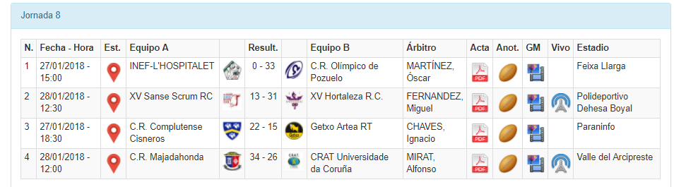 La jornada del sábado comenzaba a las 15:00 en la Feixa Llarga donde INEF-L Hospitalet recibía a las actuales campeonas del Olímpico de Pozuelo, un duelo donde ambos conjuntos no podían contar con sus jugadoras de seven que se encuentran en Sydney disputando las Series Mundiales. Sin embargo las del Omega demostraron por qué son firmes candidatas a revalidar el título y desde el minuto 1 se pusieron por delante y no dieron opción al conjunto catalán, que se queda sin sumar en casa. La victoria con Bonus le vale al Olímpico de Pozuelo el liderato provisional a la espera de lo que ocurra mañana en el partido entre Majadahonda y CRAT Universidade Da Coruña.