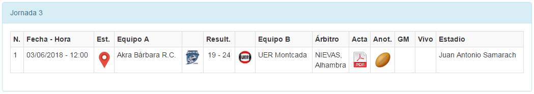 En el choque valenciano, Akra Bárbara R.C. contra UER Montcada, hubo un poco de todo; una intensa combinación de emociones marcada por 4 ensayos del equipo visitante en un espacio de tiempo inferior a 15 minutos, contestados por otros 3 de los alicantinos en un encomiable intento de remontada, o una defensa a cara de perro en los últimos minutos a cargo de UER Montcada, a pesar de las amarillas en el 70 y el 77. Un poco de todo también para la moral de cada equipo. Los visitantes demostraron su gran nivel durante toda la temporada en unos primeros 37 minutos impecables y Akra Bárbara echó el resto por revertir el marcador y consiguieron dejar todo por decidir para la vuelta, pasando de un 0-24 al 19-24 final, culminando su revolución particular con un ensayo en el minuto 80. Montcada acogerá un partidazo por nombrar al nuevo miembro del Grupo B de DHB.
