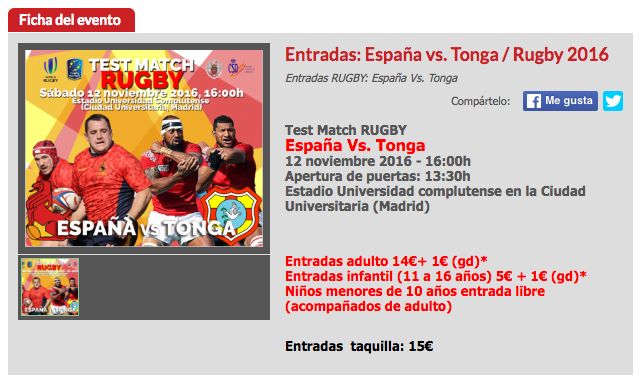 Debido a la gran expectación que está generando este encuentro se recomienda llevar la entrada ya sacada para evitar hacer colas en taquilla y no perderte la Haka que el equipo de Tonga realizará antes del inicio del encuentro.