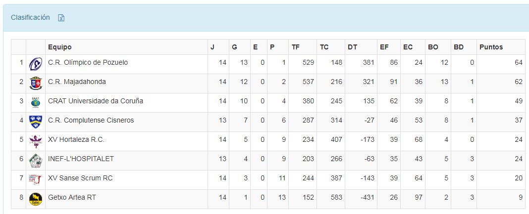 Ya tenemos campeón de la Liga Iberdrola de Rugby, y no es otro que las madrileñas del Olímpico de Pozuelo que por segundo año consecutivo se llevan la copa de campeonas al mejor equipo de rugby femenino español. A pesar de que el partido casi se les atragantó en A Coruña, las campeonas volvieron de mostrar una vez más que son un equipo de segundas partes y cerraron el marcador 12-25, dejando sin opciones al otro aspirante al título, Majadahonda, que ya había hecho el sábado los deberes contra Cisneros. En cuanto al play-out, INEF-L Hospitalet consiguió vencer a las dragonas del XV de hortaleza y deja así sin opciones al XV Sanse Scrum, a pesar de que consiguió vencer sobre la bocina en Fadura a las ya descendidas de Getxo Artea.