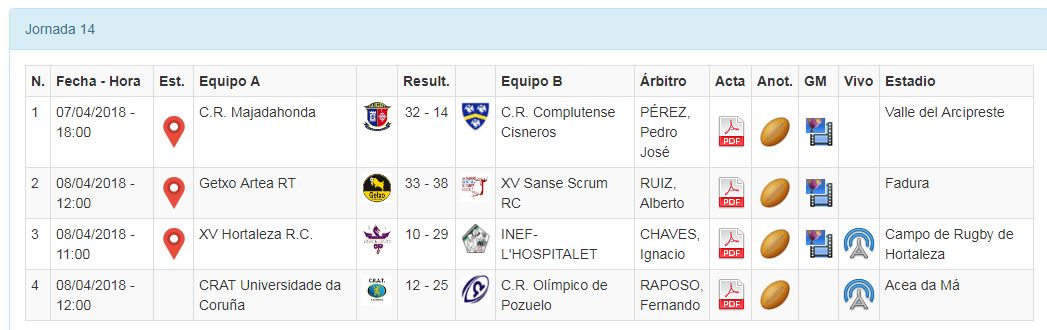 El sábado abría la jornada el derbi madrileño entre Majadahonda y Complutense Cisneros, un partido de altura a pesar de que las colegiales no contaban con la ayuda de Anne Fernández De Corres, lesionada de su rodilla. Pese a todo las visitantes consiguieron irse al descanso ganando 10-14 y casi cierran las opciones de las rinas, que tuvieron que emplearse a fondo en la segunda parte para terminar 32-14 y mantenerse como candidatas al título a la espera del resultado entre Olímpico y CRAT Universidade A Coruña.