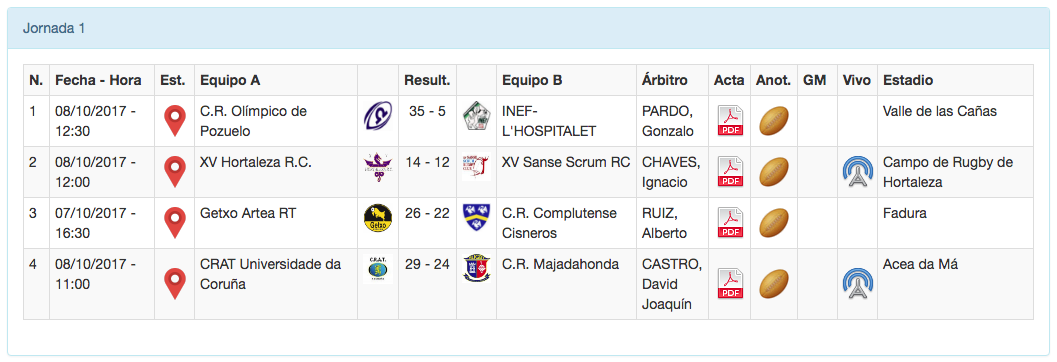 El Sábado tan sólo se disputó un partido, el retorno con derrota a la máxima categoría del rugby femenino del Complutense Cisneros que, pese a conseguir bonus ofensivo gracias a sus cuatro ensayos, no pudo con un Getxo sólido que se llevó el partido gracias a su mayor experiencia y solvencia en la segunda parte. Después de una gran primera mitad con alternancia en el marcador y que acabó 19-22 para las colegialas en la segunda un solitario ensayo, en comparación con los 7 que hubo en la primera mitad, de Marina Seral certificaba la victoria de Getxo que se acuesta líder a falta del resto de resultados.