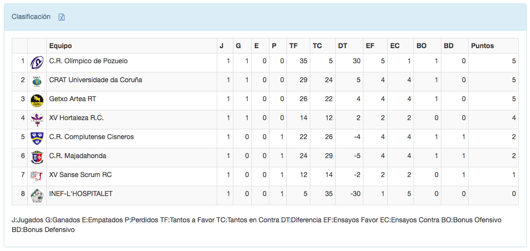 Olímpico de Pozuelo, vigente campeón de la Liga, se sitúa en lo más alto de la clasificación junto con CRAT Universidade da Coruña y Getxo Artea gracias a sus victorias con bonus, mientras que en cuarto lugar se sitúa Hortaleza que también ganó pero sin bonus. Tras las dragonas se sitúan los otros tres equipos madrileños, Complutense Cisneros y Majadahonda con dos puntos bonus y XV Sanse Scrum con sólo uno y, sin ningún punto, el primer farolillo rojo de la Liga Iberdrola de Rugby es el INEF L Hospitalet.
