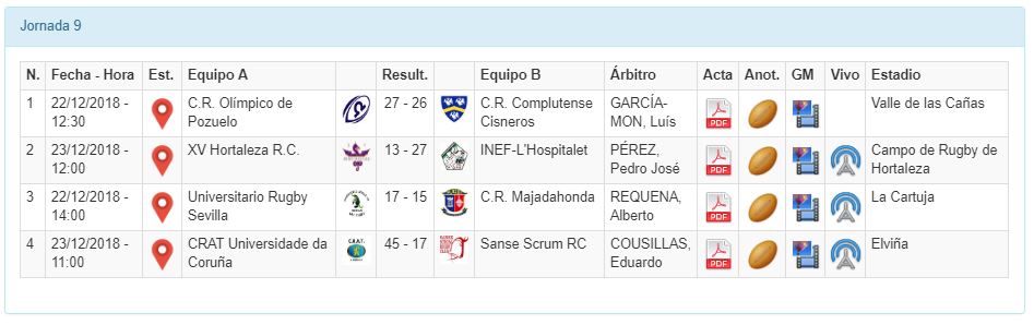 Ya en los partidos disputados el domingo, INEF-L Hospitalet y CRAT Universidade A Coruña hicieron los deberes y ganaron (13-27) a XV de Hortaleza y (45-17) a Sanse Scrum, respectivamente.