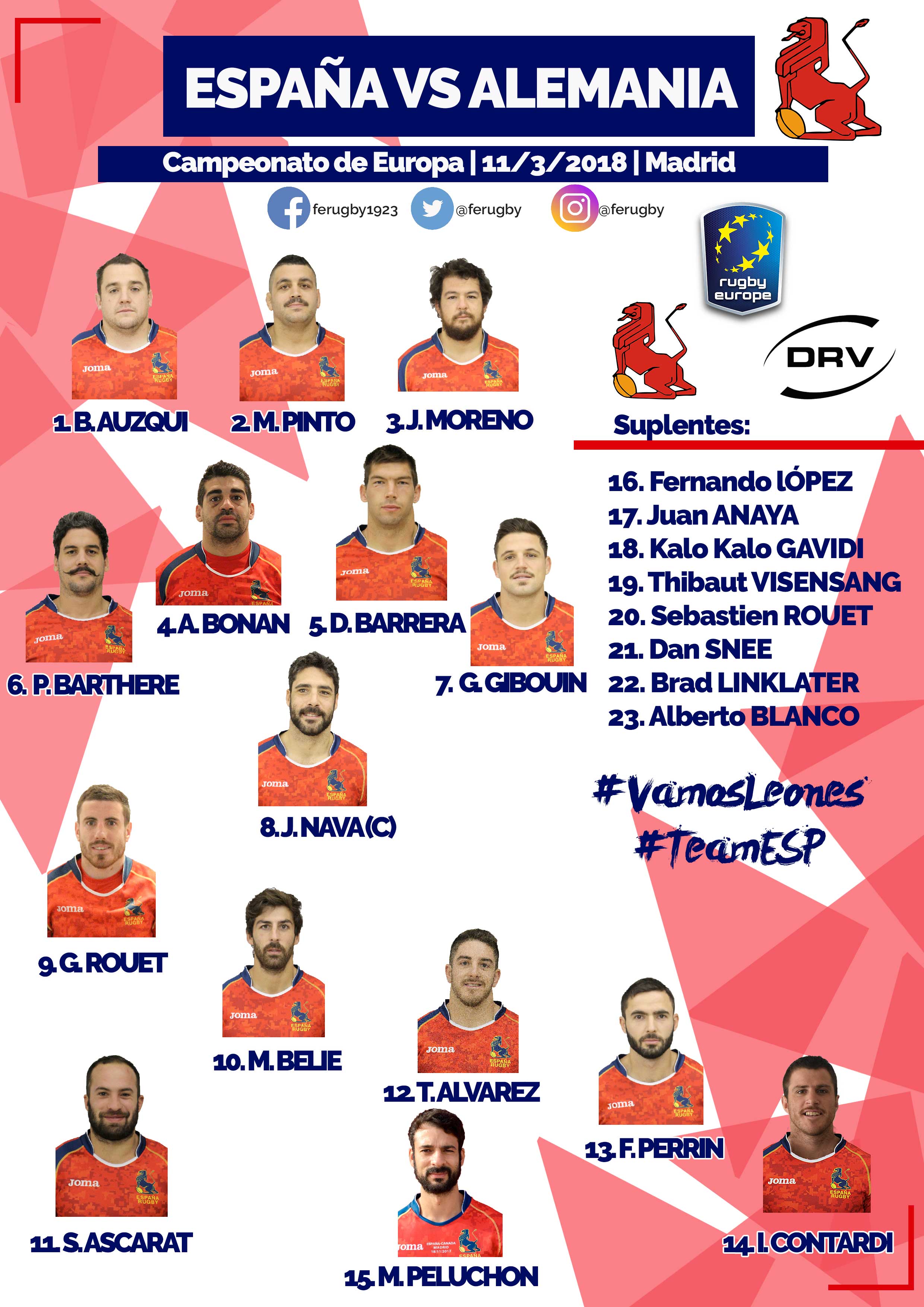 Santiago Santos ha hecho algunos cambios para este duelo en su XV de salida, en la delantera Anibal Bonan se incorpora como titular en la segunda línea y en los tres cuartos Thibaut Alvarez y Mathieu Peluchón ocupan el puesto habitual de Dan Snee y Brad Linklater. Mucha calidad en el campo y mucha madera fuera para asegurar 80 minutos de juego a máxima intensidad.