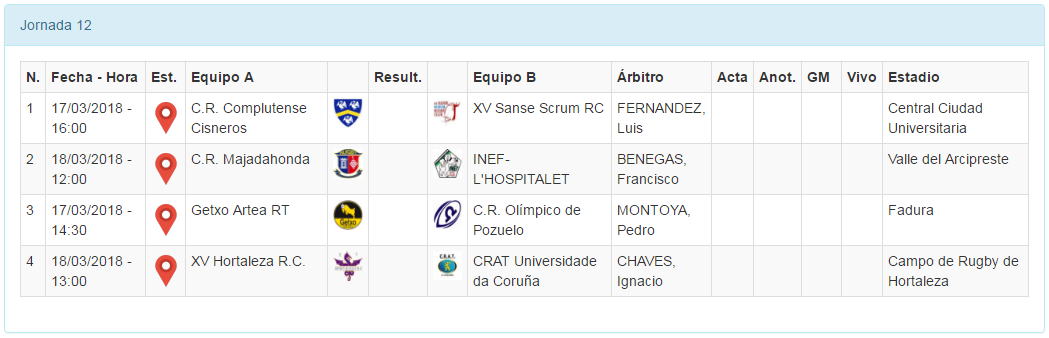 A las 16:00h dará comienzo el derbi madrileño de la jornada en un Central que no quiere parar de ver buen rugby. C.R. Complutense Cisneros y XV Sanse Scrum RC llegan con tendencias totalmente opuestas, que han hecho que las locales se asienten en la parte alta de la tabla tras varios buenos partidos y que las visitantes se vean en una situación límite, en puesto de promoción de descenso. Cisneros procurará seguir sumando para intentar alcanzar a CRAT Coruña y quitarles la tercera plaza, mientras que el conjunto dirigido por Gus Paniagua necesita ganar si no quiere ver cómo Hospitalet aumenta su distancia de 2 puntos.