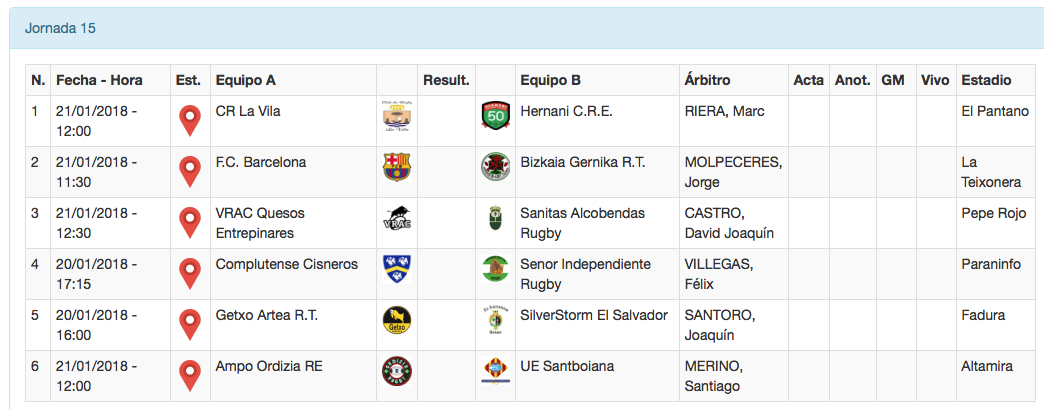 Para cerrar la jornada VRAC Quesos Entrepinares y Sanitas Alcobedas Rugby protagonizarán el duelo directo por la parte alta de la tabla, aunque los de Tiki ya están algo alejados de los dos conjuntos vallisoletanos y no le basta con ganar en Pepe Rojo para subir puestos en la general. En la ida el partido no pudo estar más igualado, y los líderes se llevaron la victoria por la mínima en el último minuto gracias al pie de Gareth Griffiths, por lo que no hay excusas para perderse el partidazo de la jornada que podrá verse en directo en la web de Teledeporte y en diferido en televisión en el mismo canal temático deportivo.