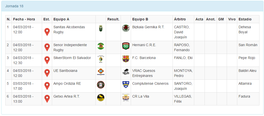 Habrá dos encuentros más en el turno del domingo a las 12:00h. Sanitas Alcobendas Rugby recibirá a un Bizkaia Gernika R.T. que ha visto cómo sus rivales directos se han aprovechado de sus últimos tropiezos y en especial el de la jornada pasada ante La Vila. Están muy necesitados de puntos y tratarán salir de Madrid con una victoria, pero los de José Inchausti solo llevan una derrota en casa y deben seguir sumando para mantener una tercera posición clave en los playoffs y quién sabe si incluso alcanzar a El Salvador. Este partido podrá verse en directo por +TDP.
