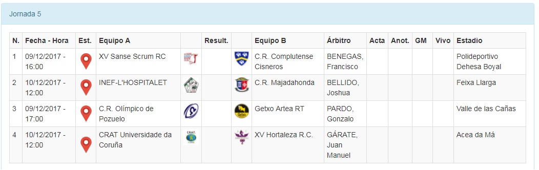 La jornada se inaugurará el Sábado a las 16:00 en el Polideportivo Dehesa Boyal con el derbi madrileño de la jornada, y a priori el partido más reñido entre XV Sanse Scrum y Complutense Cisneros. Las chicas de Gustavo llegan tras perder ante el actual líder pero dejaron muy buenas sensaciones con una segunda parte en la que casi empataron el encuentro, mientras que las colegiales tienen una semana más de descanso en sus piernas gracias al partido no disputado de la jornada 4 por la incomparecencia de INEF Barcelona.