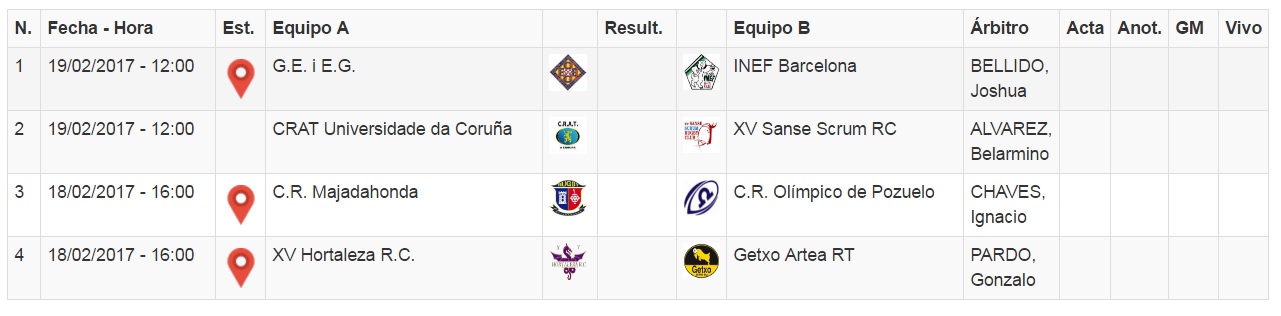 El domingo la competición se disputará íntegramente fuera de Madrid. CRAT Universidade Da Coruña jugará su segundo partido en casa a las 12:00 frente a un XV Sanse Scrum que llega a Elviña invicto, y decidido a no bajarse de los puestos de play-off. CRAT por su parte intentará repetir su única victoria en casa para colarse entre los 4 primeros y repetir la hazaña de 2015.