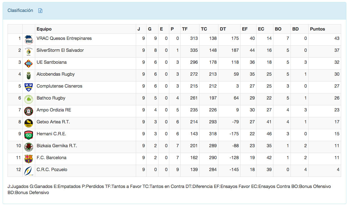 El Domingo se jugarán los otros cuatro partidos restantes, a las 12:00 jugarán los dos equipos catalanes, FC Barcelona recibirá en La Teixonera a Bizkaia Gernika, undécimo contra décimo, empatados a puntos. Y la UE Santboiana viajará hasta Getxo para jugar en Fadura, un campo que siempre es complicado. Y a las 12:30 jugarán el sexto contra el quinto y el segundo contra el primero: En San Román el Bathco Rugby recibirá al Complutense Cisneros sabiendo que en caso de ganar adelantarán a los madrileños y podrían ascender hasta la cuarta posición. Y para cerrar la jornada el derbi más caliente del rugby español, el SilverStorm El Salvador recibe lanzado al líder invicto de División de Honor, el VRAC Quesos Entrepinares. Decimo que los chamizos están lanzados puesto que son el mejor ataque de la Liga, con 335 puntos y tienen el mejor balance, con 187 a favor.