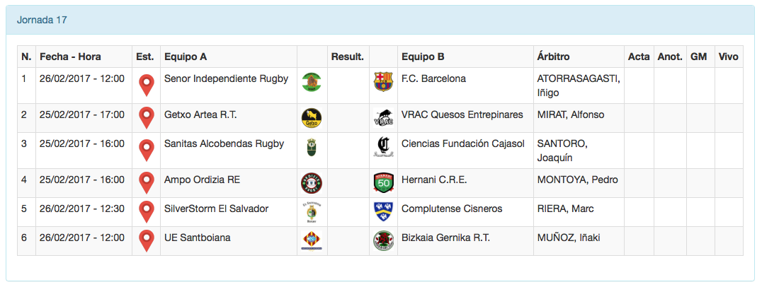 El domingo los más madrugadores serán los equipos catalanes y sus rivales que jugarán a las 12:00. El Senor Independiente, sexto, recibirá al FC Barcelona, noveno, ambos conjuntos con el mismo objetivo sacar ventaja a sus perseguidores: los locales quieren distanciarse del Ordizia y asegurar la sexta plaza que da acceso al Play Off y los azulgrana seguir sumando puntos que les distancien de los últimos tres clasificados. El decano del rugby español, la UE Santboiana, jugará frente al Bizkaia Gernika dos equipos que llegan con trayectorias bien distintas: los de Sant Boi llegan con la moral bien alta después de clasificarse para la final de la Copa de S.M. El Rey y la remontada ante el Complutense Cisneros en la última jornada mientras que el Gernika encadena dos derrotas consecutivas.