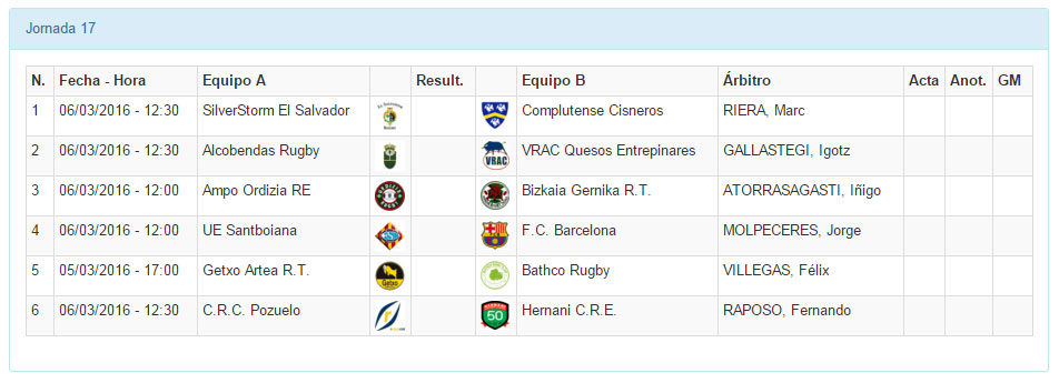 El resto de la jornada se jugará a las 12:30, donde el líder viajará hasta Las Terrazas para vivir la revancha por las semifinales de Copa del Rey, Alcobendas Rugby tratará de que no se le vuelva a escapar la victoria frente al campeón, VRAC Quesos Entrepinares. Y cerrarán la jornada los dos duelos más emocionantes porque se jugarán, de manera directa o indirecta, una posición en la clasificación. SilverStorm El Salvador, segundo clasificado, recibirá al Complutense Cisneros, tercero a un punto, con la clasificación directa para las semifinales de Liga en la mente. En la situación contraria se encuentra el CRC Pozuelo, farolillo rojo de la tabla, que jugará en el Valle de las Cañas frente al penúltimo, Hernani, con el objetivo de recortarle el mayor número de puntos posible y seguir con vida en Liga.