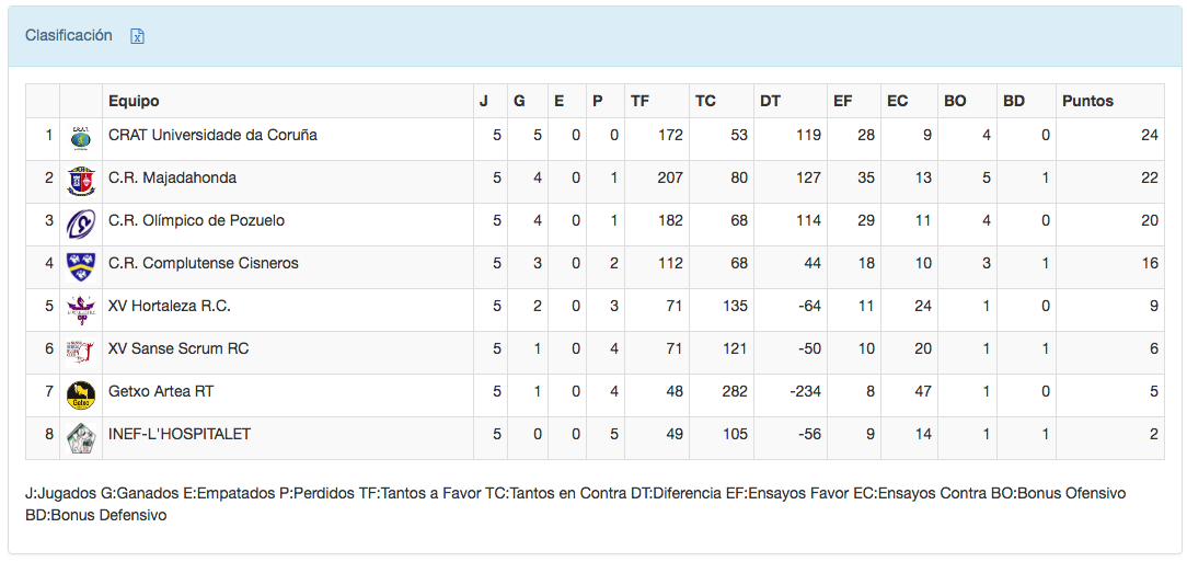 CRAT Universidade da Coruña gracias a su victoria, 20-0, sobre el XV de Hortaleza sigue en lo más alto de la clasificación de la Liga Iberdrola de Rugby perseguida de cerca por Majadahonda que gracias a vencer al INEF L Hospitalet sigue a tan sólo dos puntos de las gallegas. Tras ellas el vigente campeón, Olímpico de Pozuelo, que ganó ayer a Getxo Artea y cierra el grupo en cabeza el Complutense Cisneros que con su victoria ante el XV Sanse Scrum se asienta en la cuarta posición.