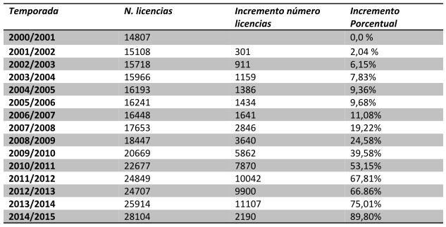 En la Gráfica se observa que, durante los primeros años, el incremento de licencias es muy paulatino y no se aprecian aumentos significativos en el número de licencias de Rugby, suponiendo apenas un 2% con respecto a la temporada anterior. Debido al trabajo realizado y al intento de expandir y hacer llegar el Rugby al mayor número de jugadores posibles, durante las temporadas 2009/10, 2010/2011 y 2012/13 hay un considerable aumento en el número de licencias, generando que durante estas temporadas hubiera más de 2000 nuevas licencias en relación a la temporada anterior. En la temporada 2012/13, hay un mínimo receso en el número de licencias (142 menos) debido al aumento considerable durante esa temporada de la cantidad que había que había que pagar por el seguro deportivo. Dicho descenso únicamente se ha producido durante una temporada, volviendo a producirse un considerable ascenso durante la temporada 2013/14 como en la temporada 2014/2015.