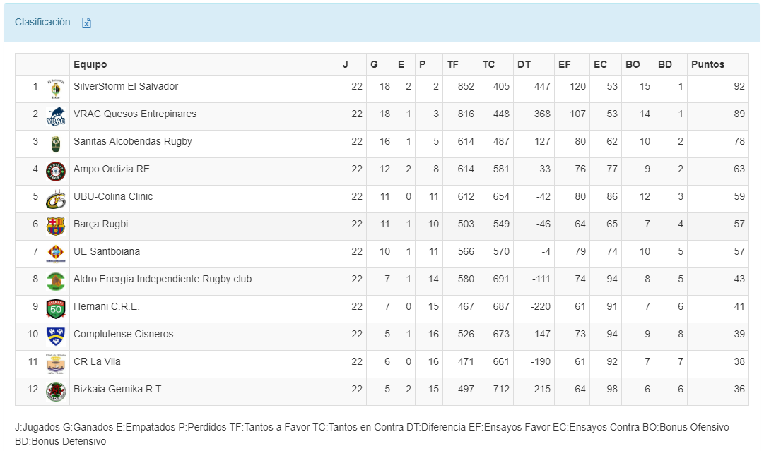 En la mitad baja de la tabla, vemos al Bizkaia Gernika R.T. con mejores dígitos que lo que hace presuponer su posición final en el campeonato. Que hayan perdido la categoría muestra lo disputado que ha estado el descenso hasta el final. La U.E. Santboiana y el Aldro Energía Independiente R.C. son los más lastrados a nivel anotador con respecto a la campaña anterior, sin duda un factor fundamental a la hora de explicar por qué dos equipos tan potentes se han quedado fuera de los playoffs.