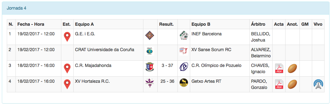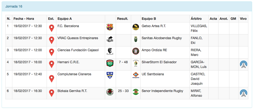 Solamente se han disputado dos partidos de cada una de las máximas categorías del rugby nacional, la División de Honor masculina y la División de Honor Iberdrola. Tres de los partidos se disputaron a las 16:00, los dos de la máxima categoría femenina y el Hernani - SilverStorm El Salvador, y tan sólo uno a las 16:30 el que acabó con la victoria del Senor Independiente 25-33 ante el Bizkaia Gernika lo que asienta a los bisontes, a la espera de lo que haga AMPO Ordizia, en la sexta posición.