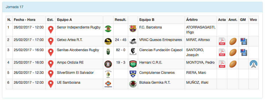 Los favoritos se han impuesto en los partidos adelantados al sábado de la decimoséptima jornada de División de Honor. El VRAC Quesos Entrepinares se acuesta líder después de ganar al Getxo Artea en Fadura por 24-45, seguido del Sanitas Alcobendas Rugby que también ha ganado su partido de hoy ante el Ciencias Fundación Cajasol por un abultado 82-0. AMPO Ordizia también asciende en la tabla, entrando en la zona de Play Off a la espera de lo que haga el Senor Independiente, después de ganar a Hernani 19-3 en Altamira.