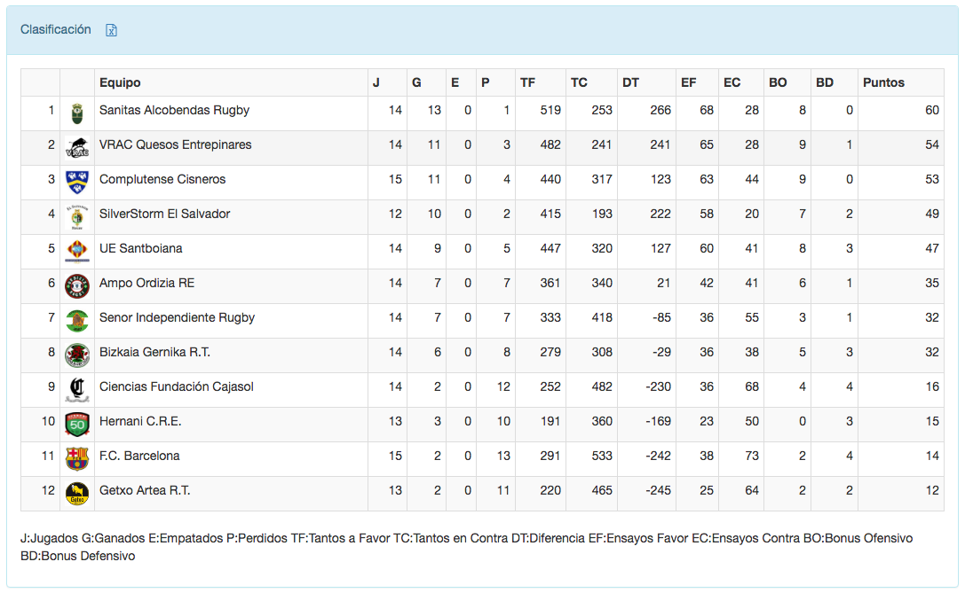 El líder, Sanitas Alcobendas Rugby, abrió la decimoquinta jornada ante su público frente al penúltimo clasificado, el FC Barcelona, y celebró su vuelta a la primera posición con un festival de ensayos, nada menos que ocho ensayos para los locales por tres para los visitantes. Los hombres de Tiki Incháusti después de llegar al descanso 45-3 se dejaron llevar en la segunda parte cosa que aprovecharon los azulgrana para cerrar el marcador en el 52-24 final.