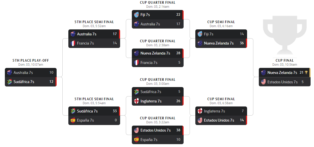 Las semis por el 5º puesto, ronda donde no suele ser habitual ver a Sudáfrica, los Blitzboks lograron ensayar en el primer minuto tras un arranque fulgurante. La sobresaliente capacidad de los actuales campeones de las Series Mundiales para forzar retenidos y demás golpes de castigo hizo que tras la buena respuesta de los Leones7s en un principio, las cosas empezasen a ponérsele muy cuesta arriba a los nuestros, que cometieron varios errores en campo contrario que fueron duramente penalizados. En esta tesitura, el rival se encontró muy cómodo y alcanzó la cifra de 5 ensayos, sellando su pase a la final por el 5º puesto con el 33-0 definitivo.