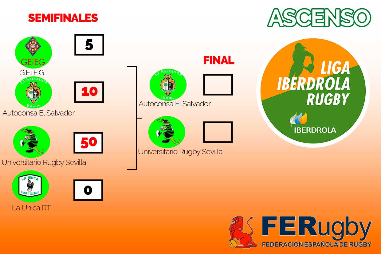 Este domingo se han disputado las dos semifinales del ascenso a la máxima categoría del rugby femenino español, la Liga Iberdrola de Rugby, que se han saldado con sendas victorias y su correspondiente pase a la final del Autoconsa El Salvador que se ha impuesto 5-10 a G.E.i.E.G. y del Universitario de Sevilla que ha ganado con facilidad por 50-0 a las representantes vascas de La Unica. La final enfrentará a las dos vencedoras en un campo neutral, salvo mutuo acuerdo para jugar en La Cartuja o Pepe Rojo.