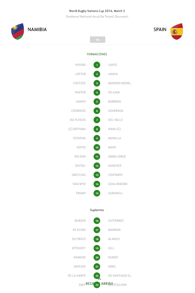 Santiago Santos y Miguel Velasco hacen 4 cambios en el XV inicial, se caen por decisión técnica Nuñez, Muñoz-Rivero y Castiglioni entrando en su lugar De Juan, Del Valle y Jorba; mientras que Álvarez tiene que dejar su sitio a Sánchez ya que en el anterior partido sufrió una leve conmoción y por el protocolo internacional debe descansar un partido.