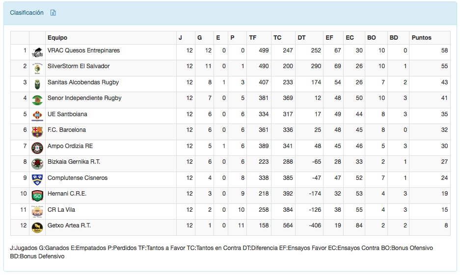 La duodécima jornada de la Liga Heineken deja al VRAC Quesos Entrepinares y al SilverStorm El Salvador en lo más alto de la clasificación cogiendo distancia con sus perseguidores después del empate del Sanitas Alcobendas Rugby. En la parte baja Getxo Artea sigue última, después de ir ganando su partido durante más de 60 minutos, y el Complutense Cisneros empieza a mirar al último puesto de la zona de Play Off después de su victoria ante Hernani.