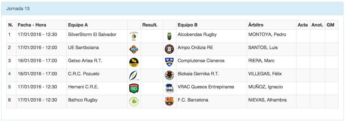 Solamente se disputarán dos partidos el sábado 16 de enero, los dos a la misma hora, las 17:00 en Fadura y en el Valle de las Cañas donde se verán dos partidos bien distintos: En el País Vascos el Getxo recibe al Complutense Cisneros, sin sus internacionales de seven, pero con el más que probable estreno en ésta Liga de Jesús Recuerda. Mientras que en Madrid los hombres de Miguel Ángel Puerta buscan su primera victoria ante un rival directo por la permanencia como es Bizkaia Gernika.